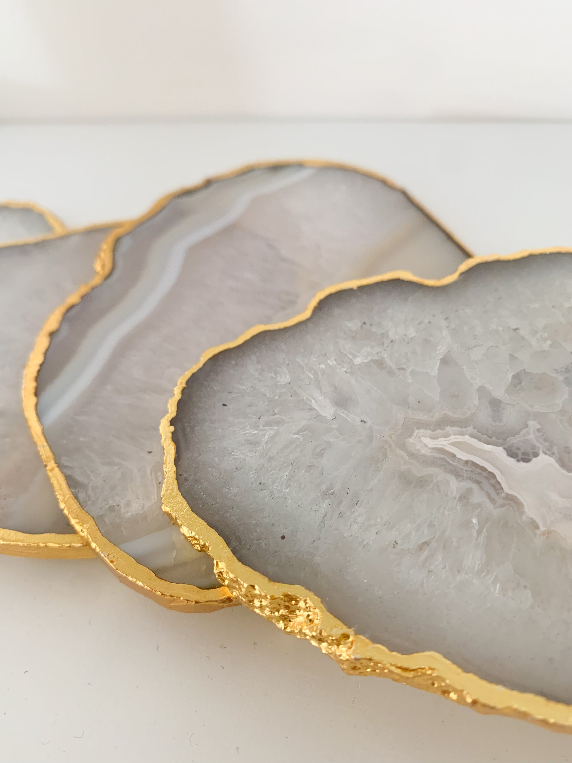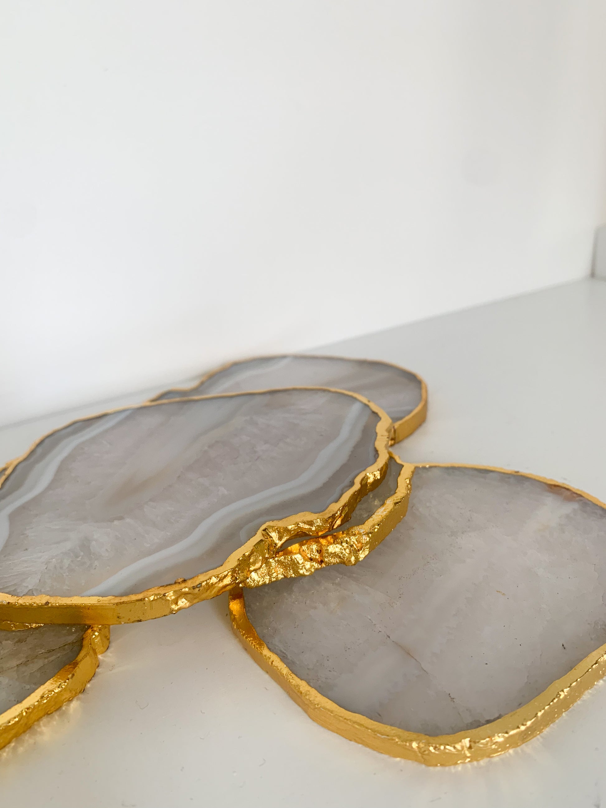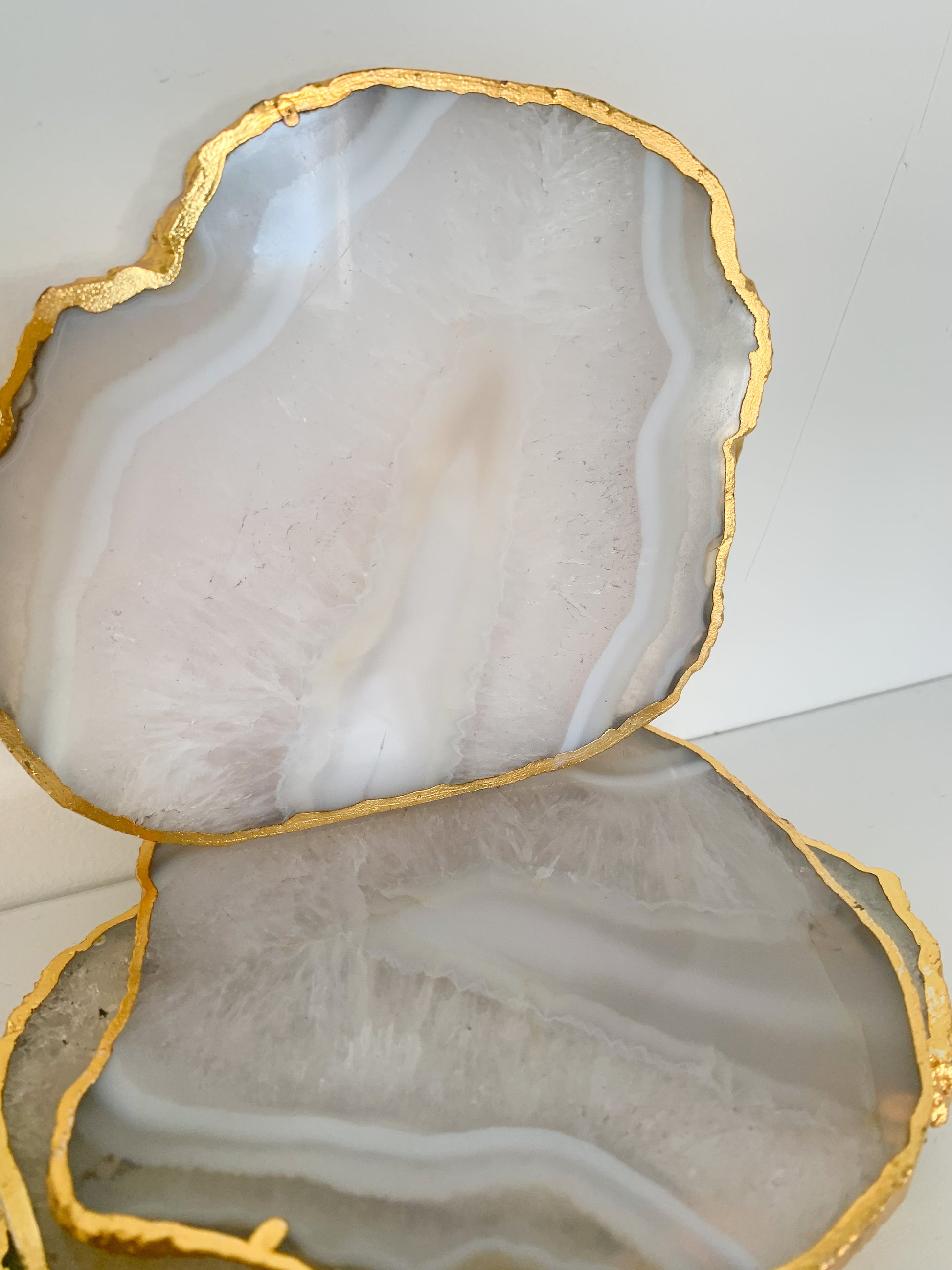 Our beautiful white and gold coasters can be purchased individually or in a set 2,3 or 4 which are a beautiful addition to elevate any room. One agate coaster is perfect for a new job gift or leaving gift as it's a beautiful addition to your desk decor. Go for a set of 2 coasters for your bedside table decor. An extra special housewarming gift or hostess gift. Four coasters can be used in the kitchen, dining room, living room, bedroom and office. Or use to display candles on around the home.