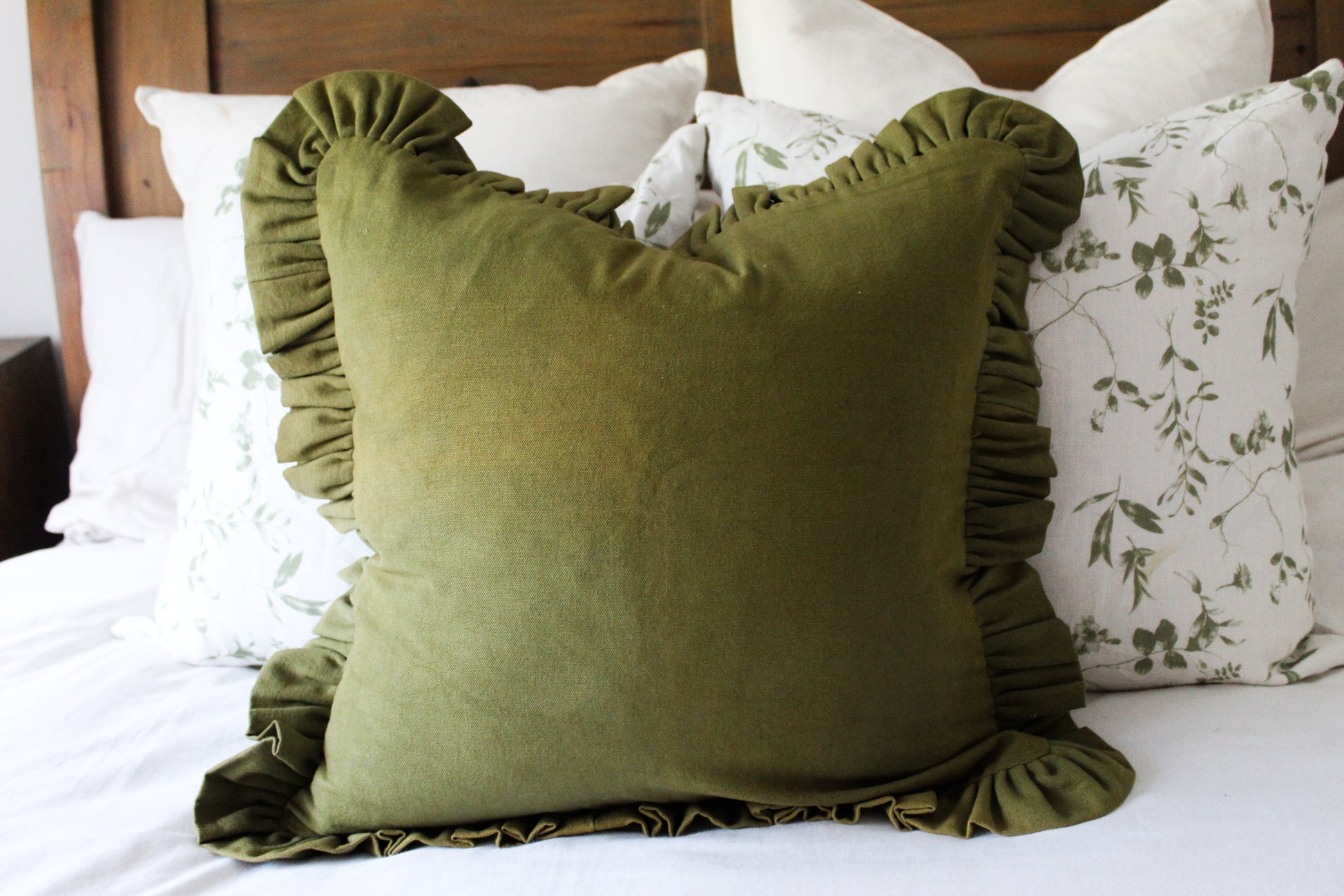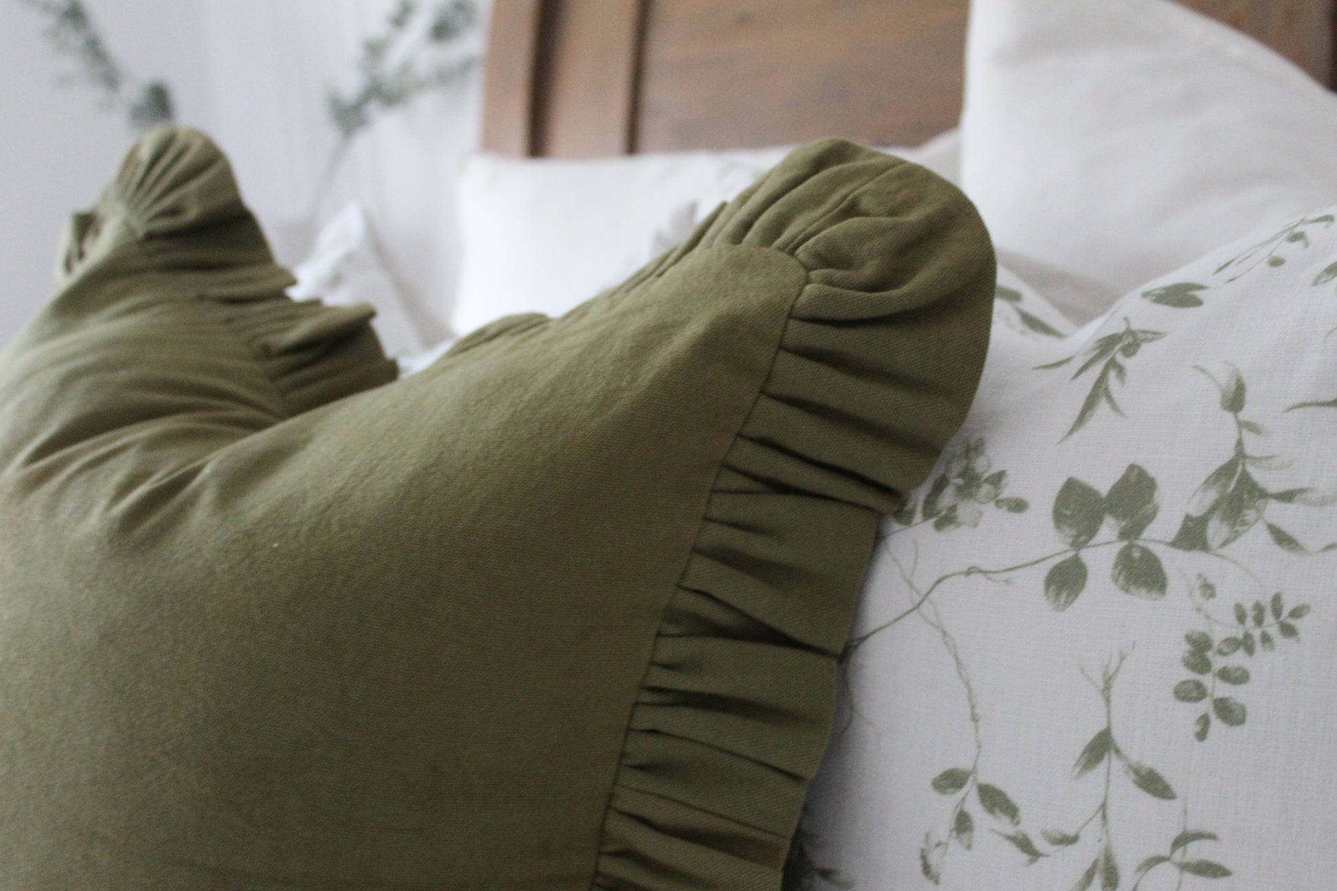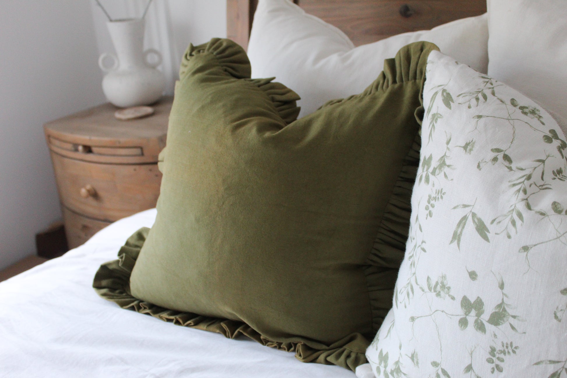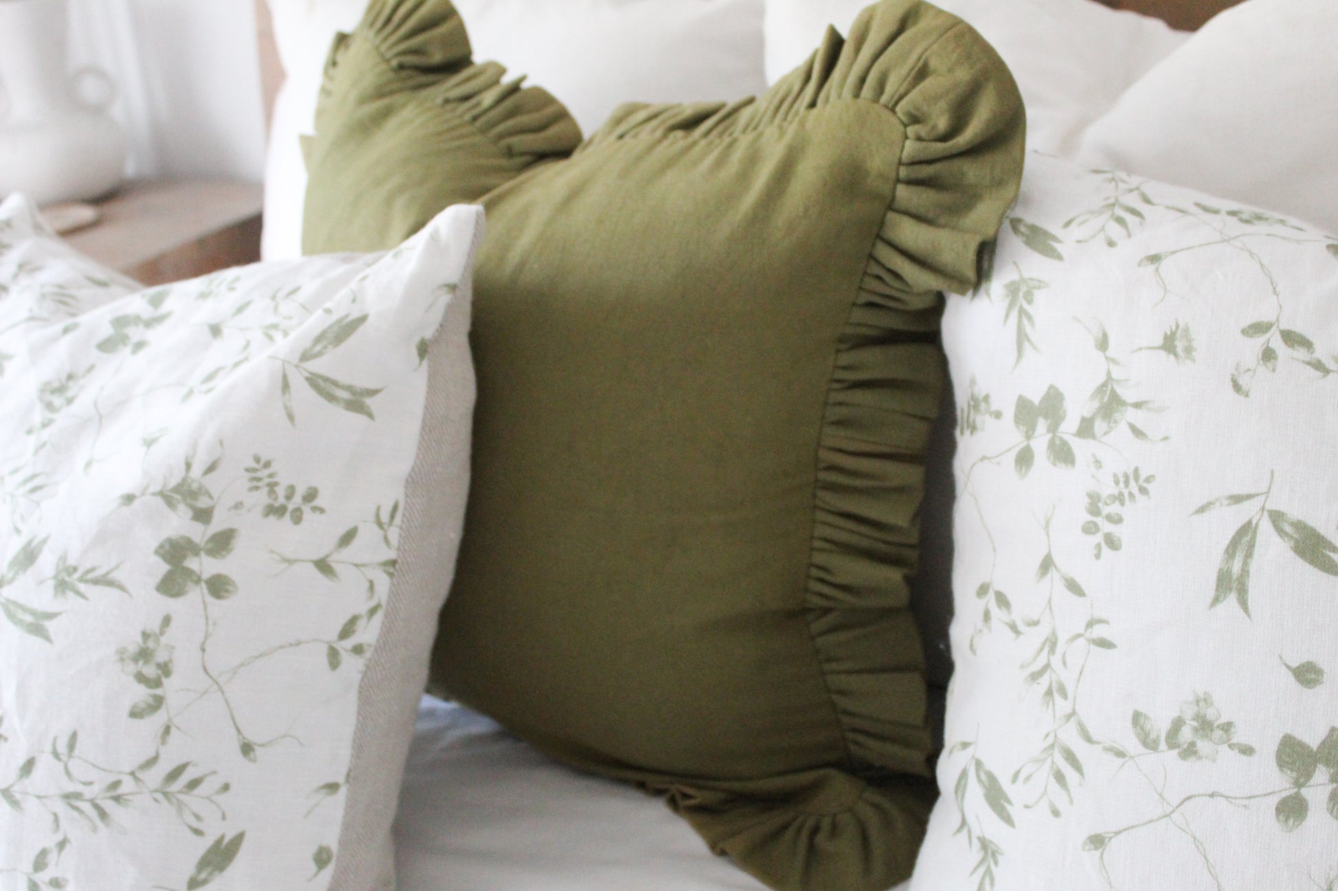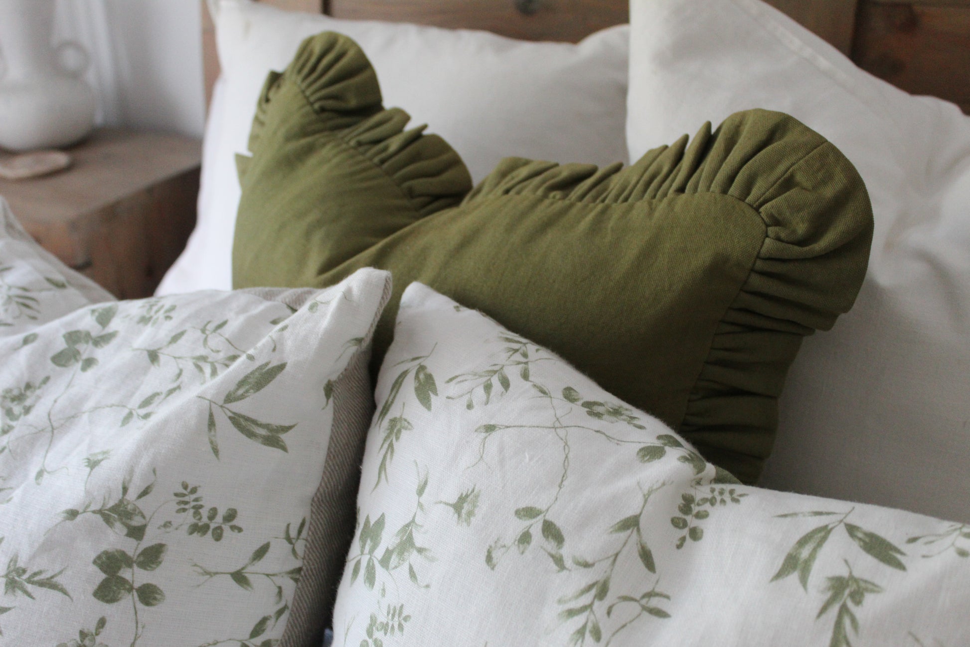 Add a touch of elegance to your home decor with this beautiful green frilly linen cushion cover. Measuring 45 x 45cm, this cushion cover is the perfect way to update your living room or bedroom with a chic and stylish look. Made from high-quality linen, it is not only stylish but also durable and easy to care for. Elevate your space with this sophisticated cushion cover that effortlessly blends classic floral design with a contemporary Colour palette.