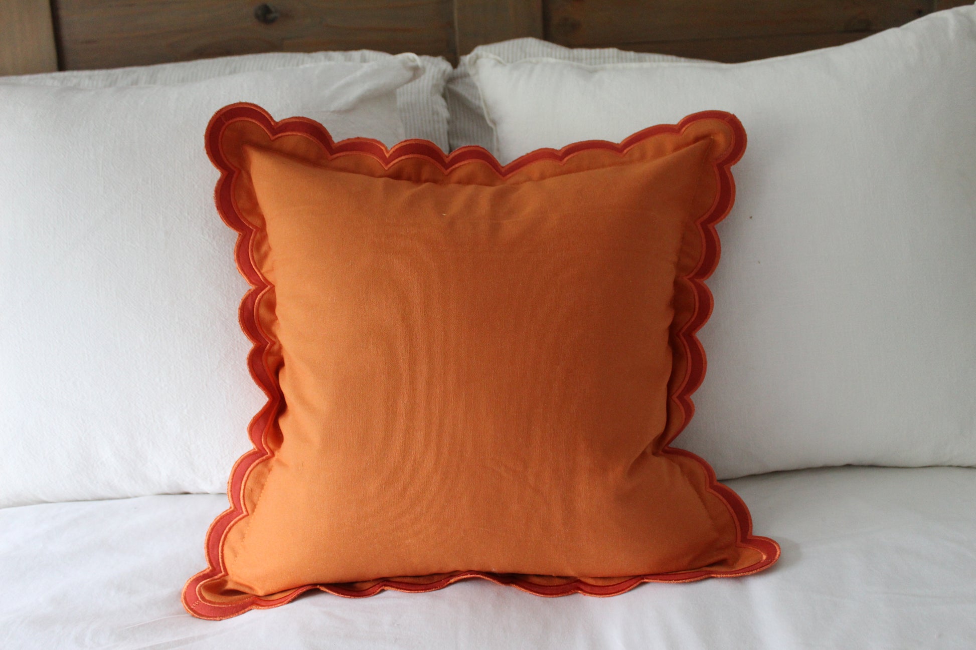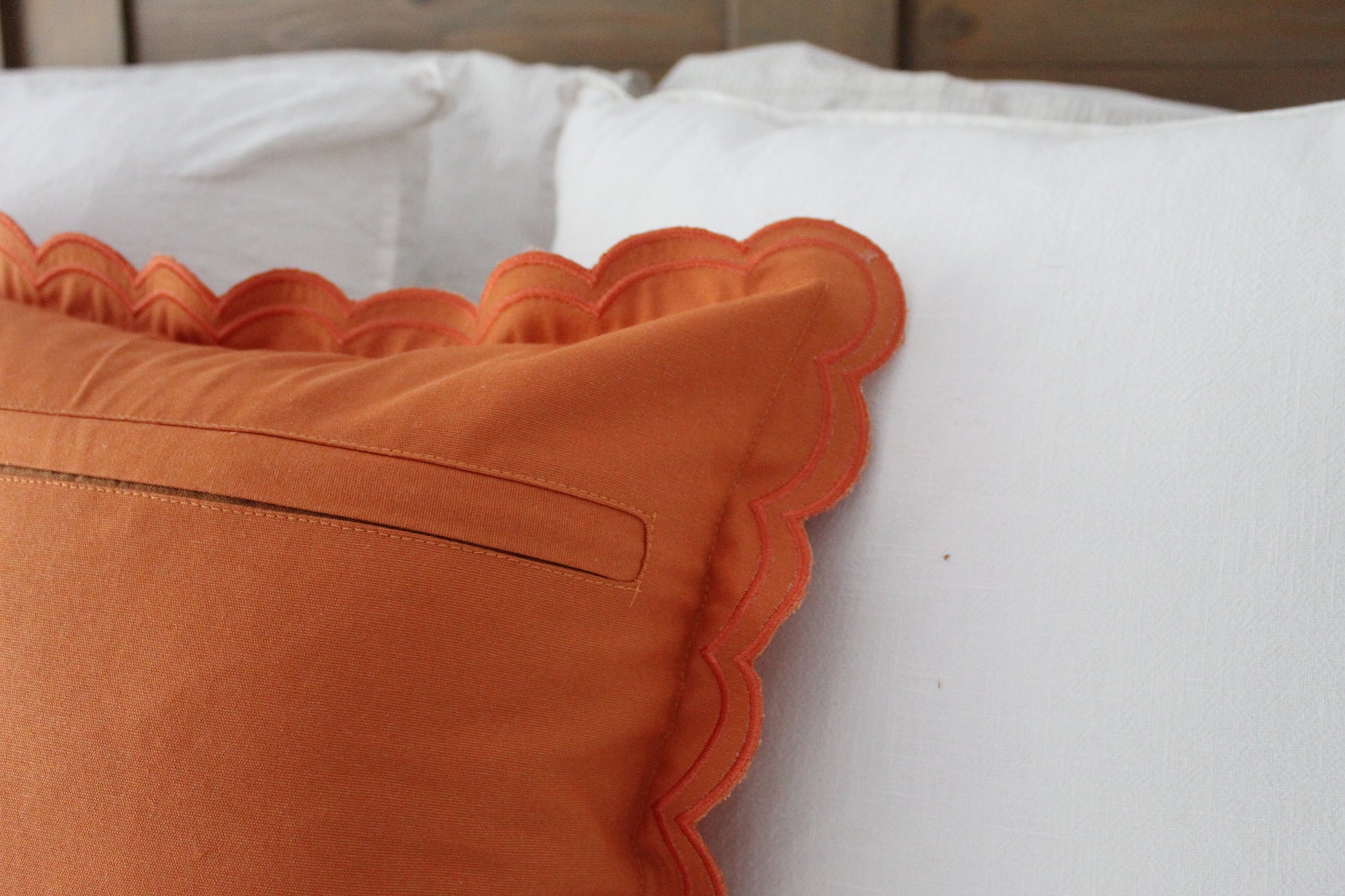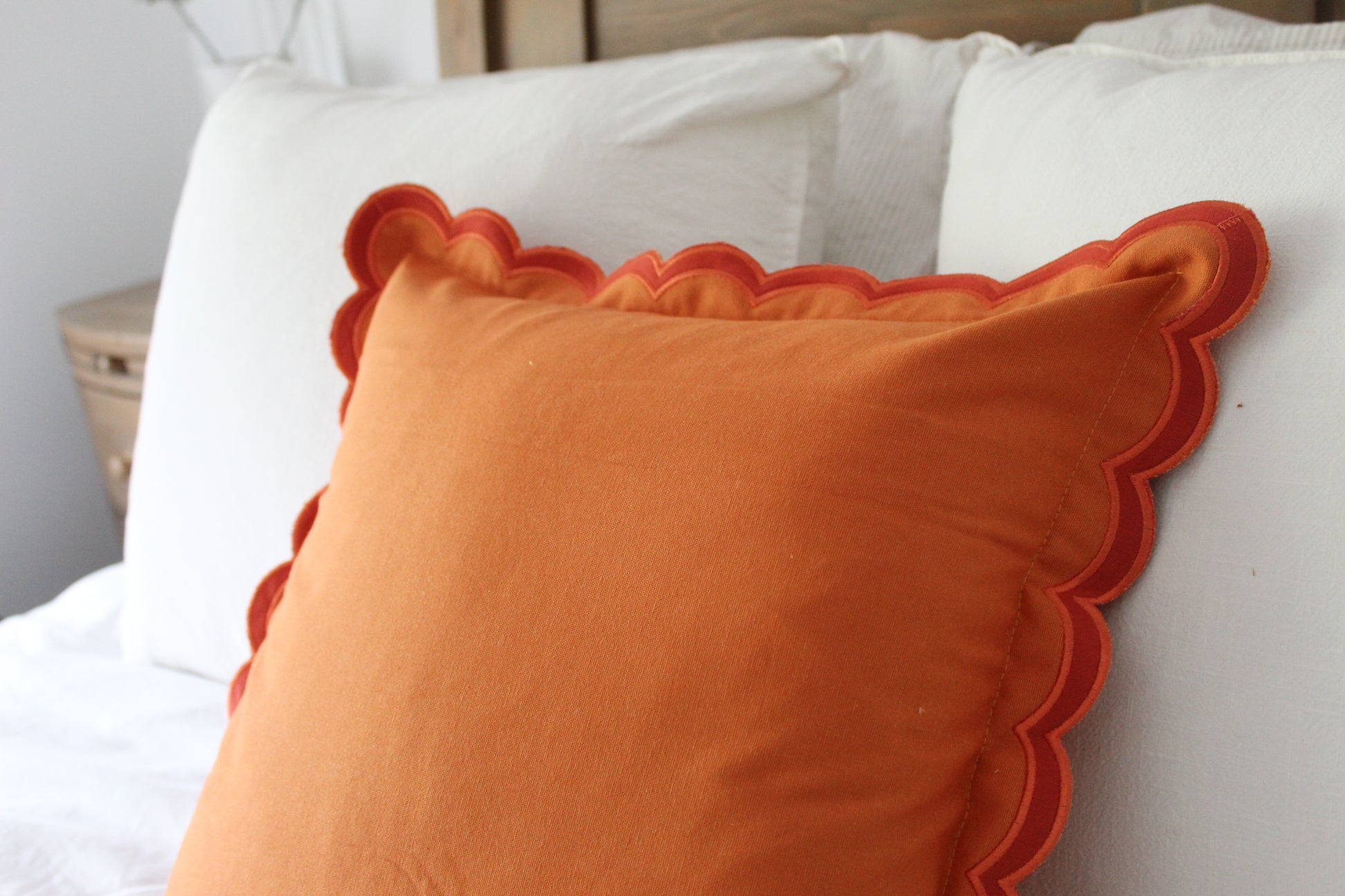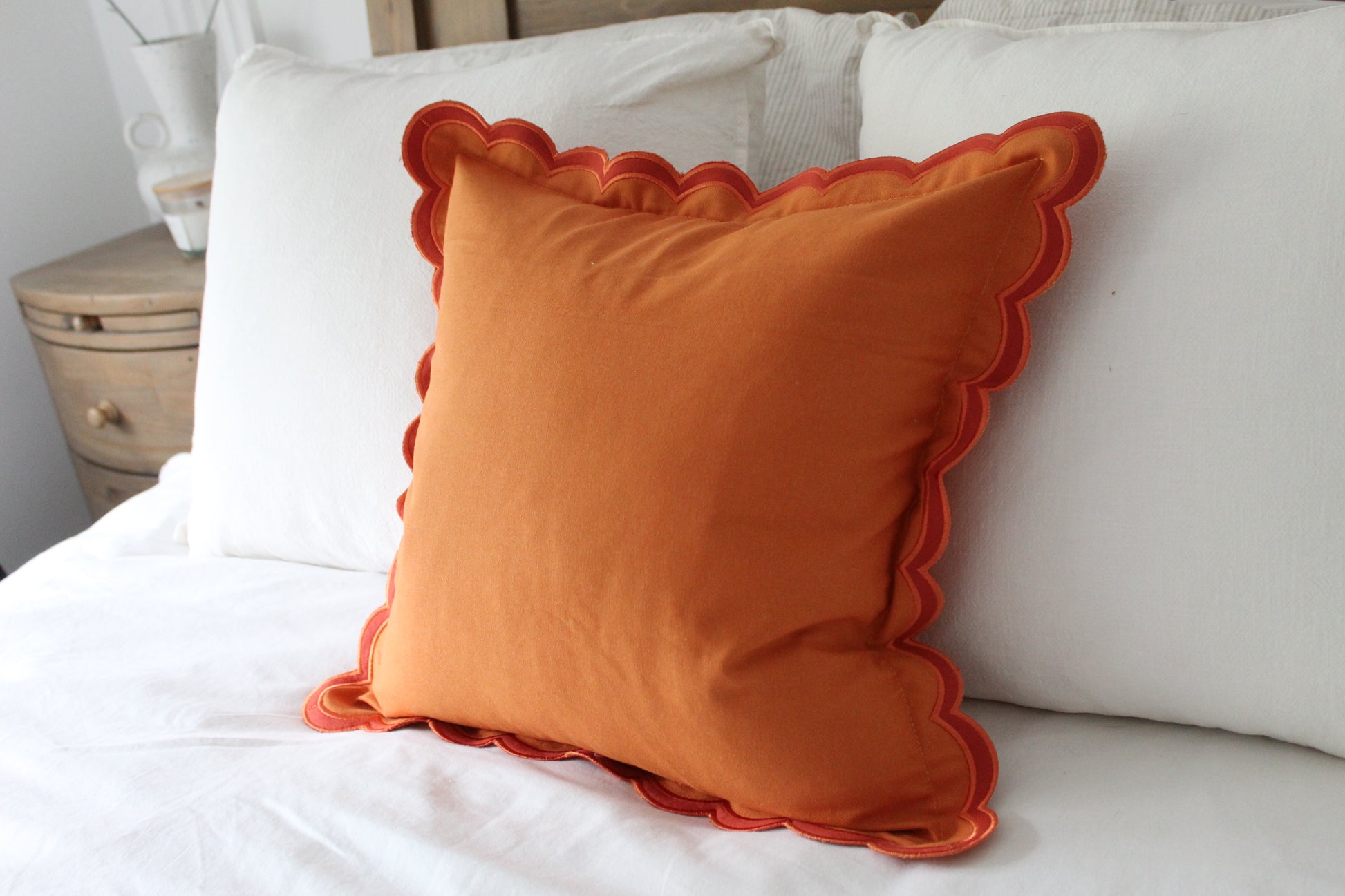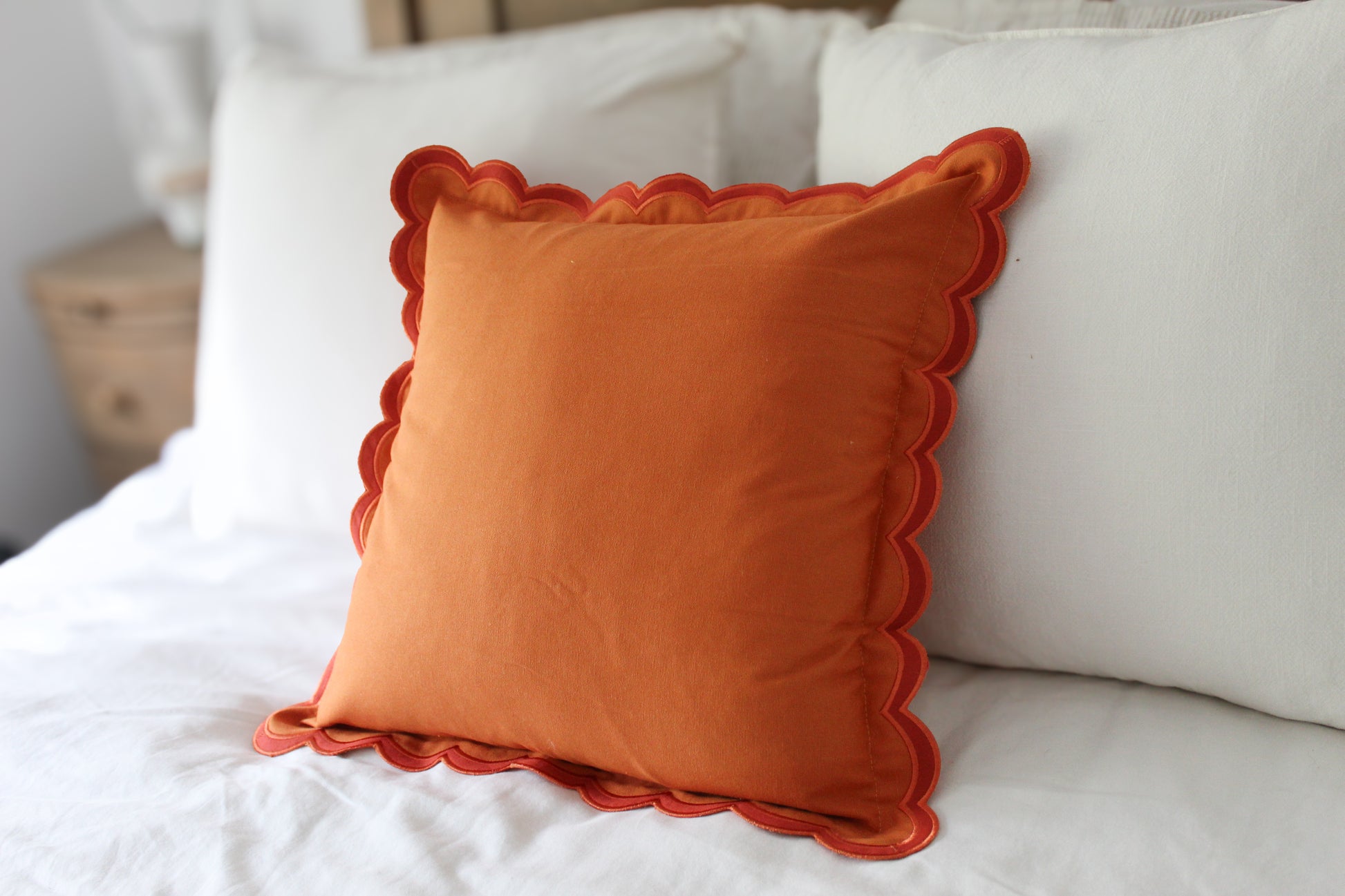 Orange scalloped edge cotton cushion with duck feather inserts 45 x 45cm