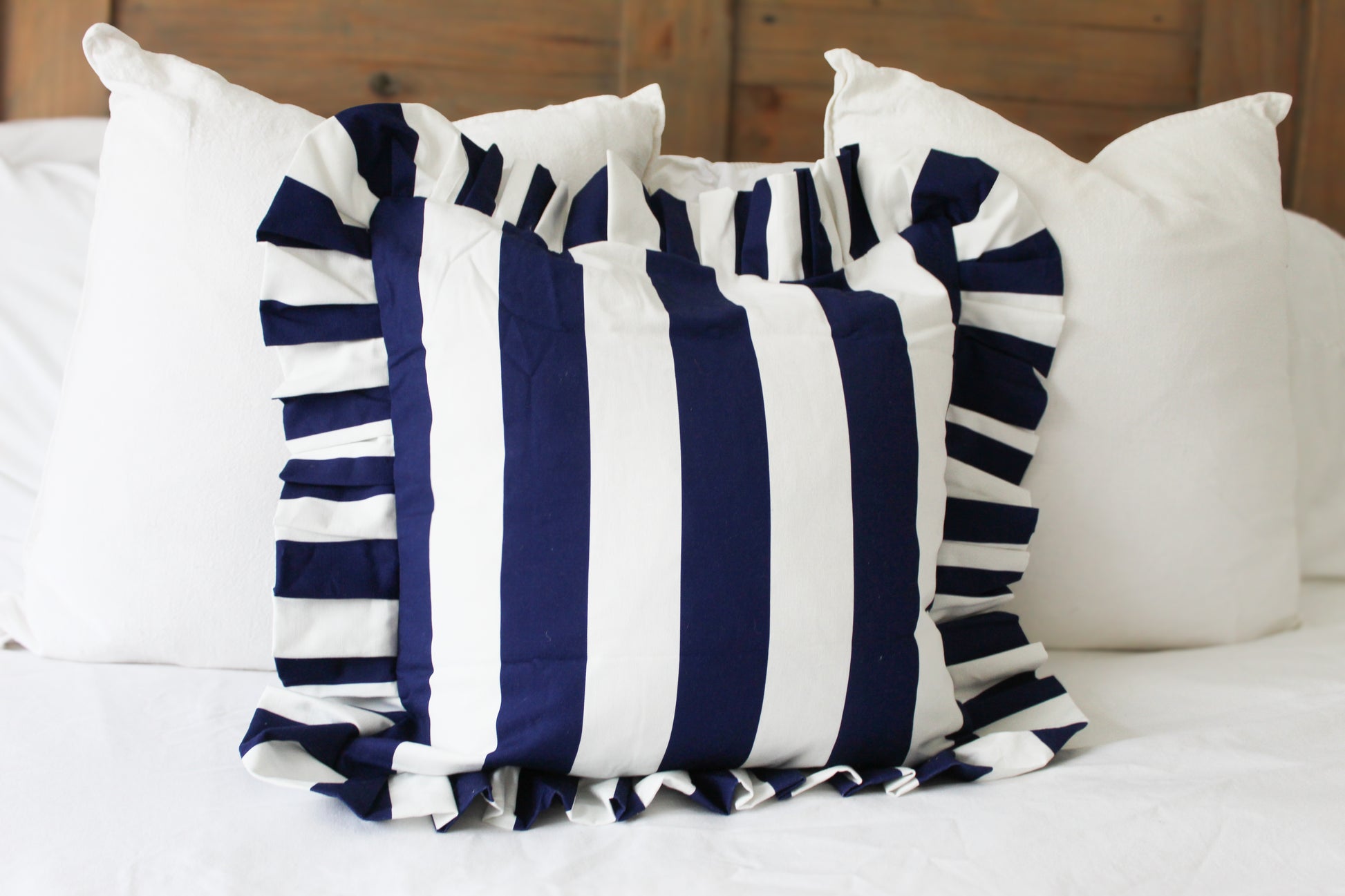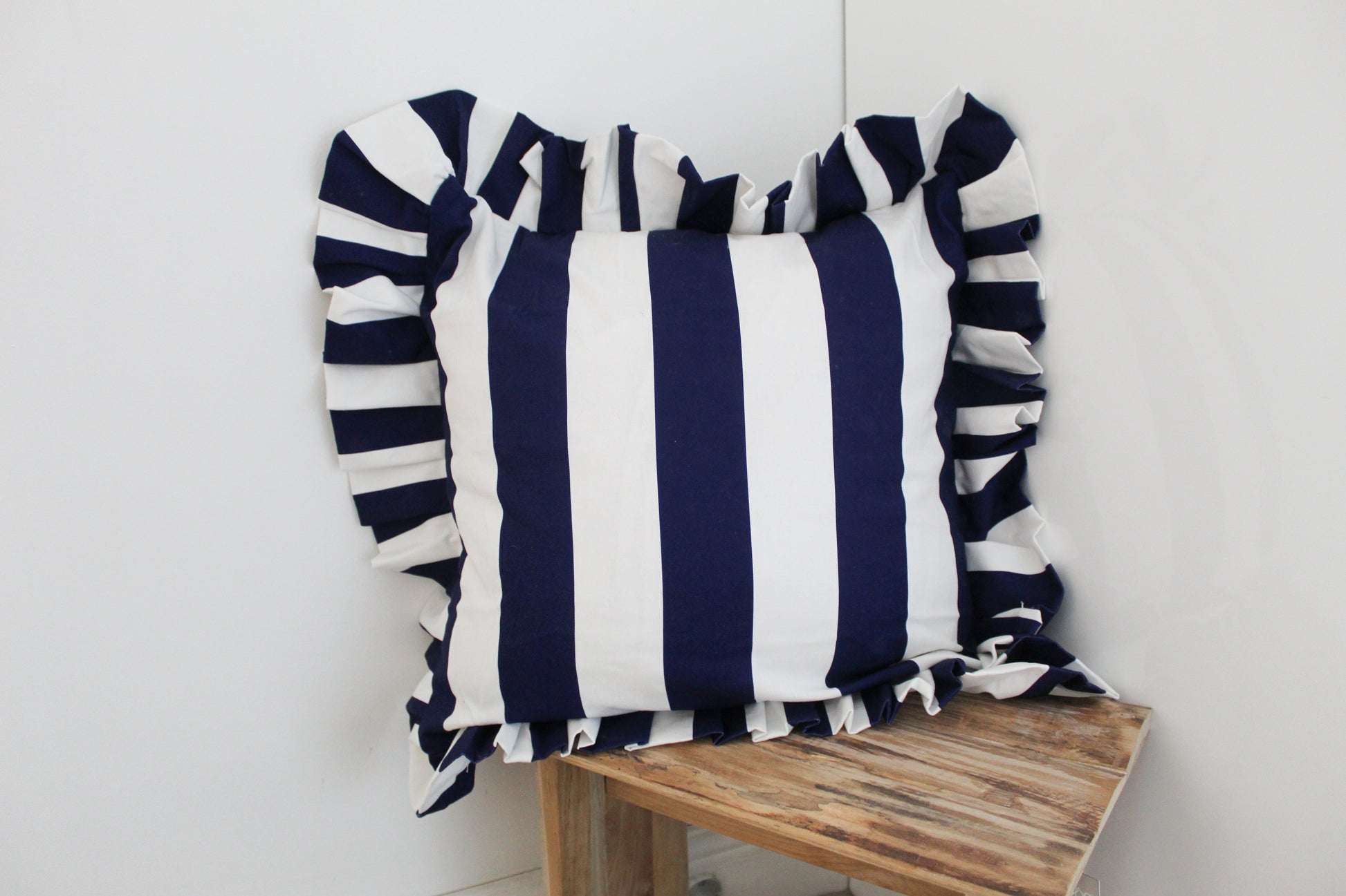 Ruffle navy stripe cotton cushion with duck feather inset 45x45cm