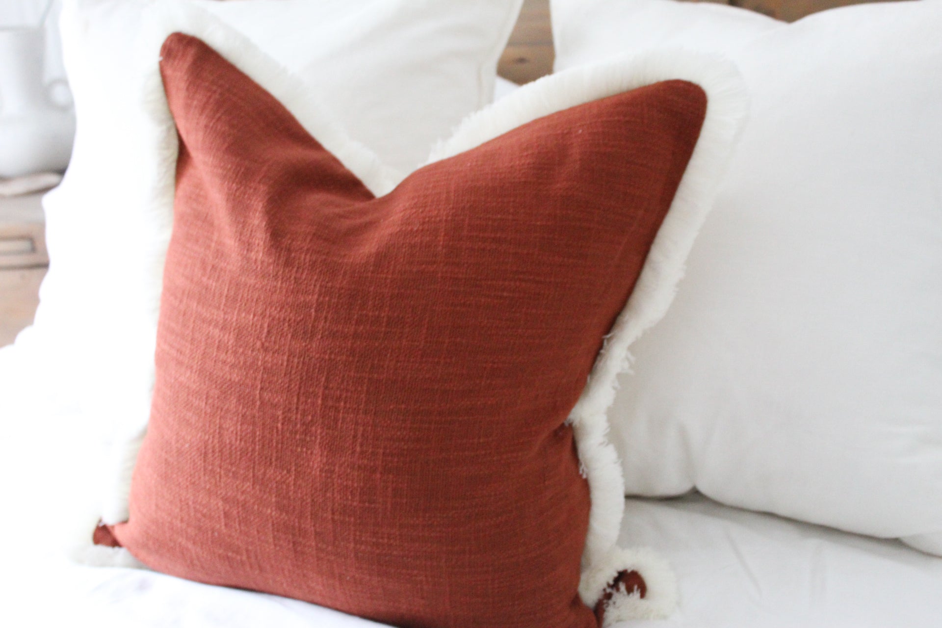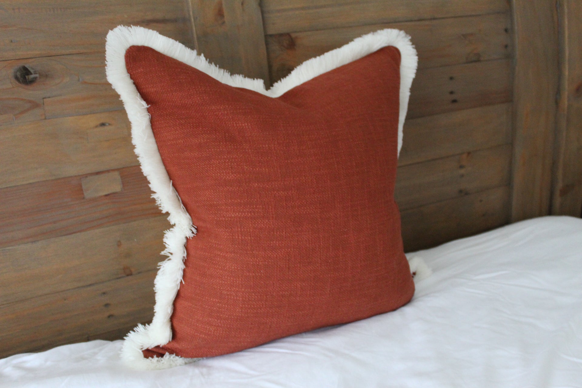 Terracotta fringed cream trim cotton cushion 45 x 45cm
