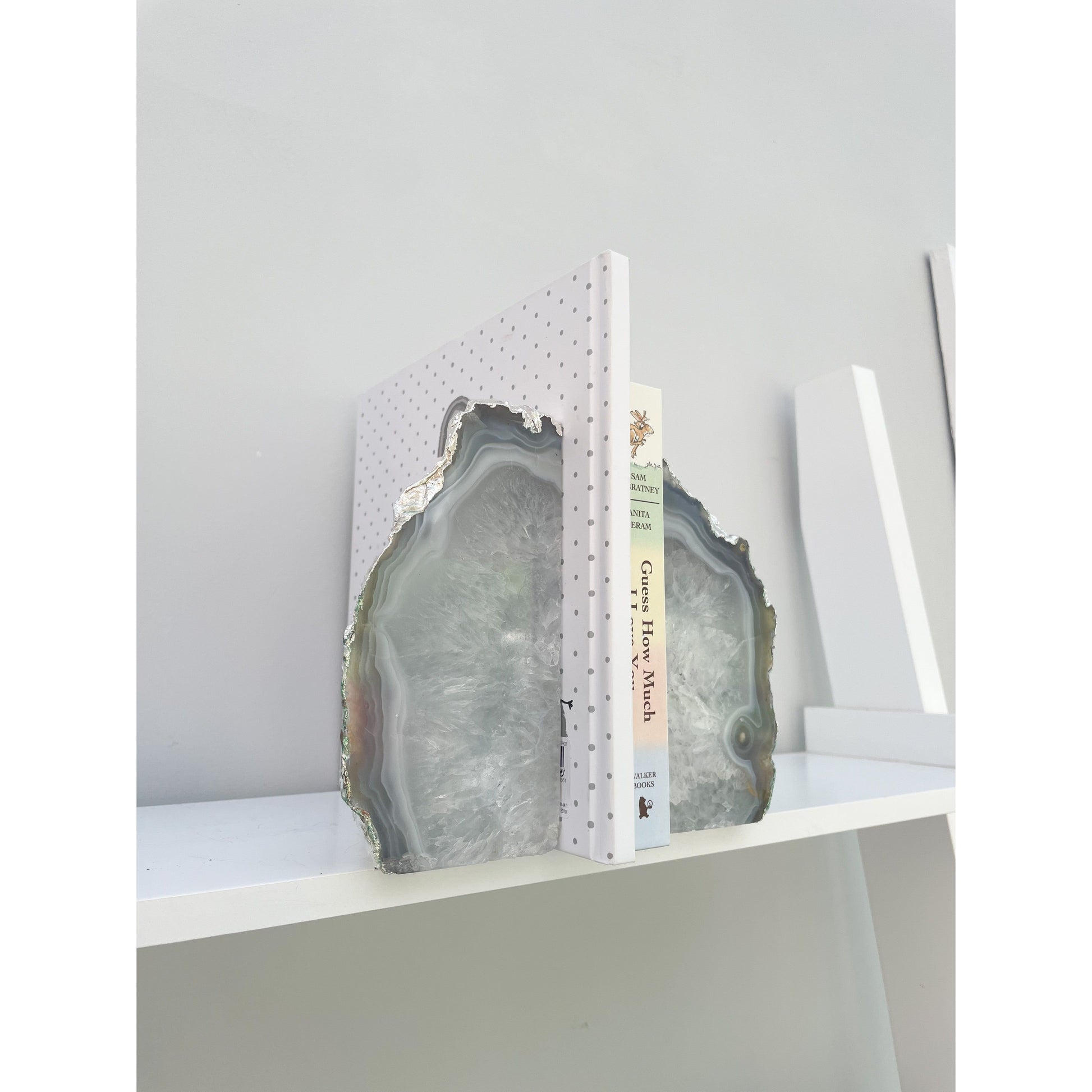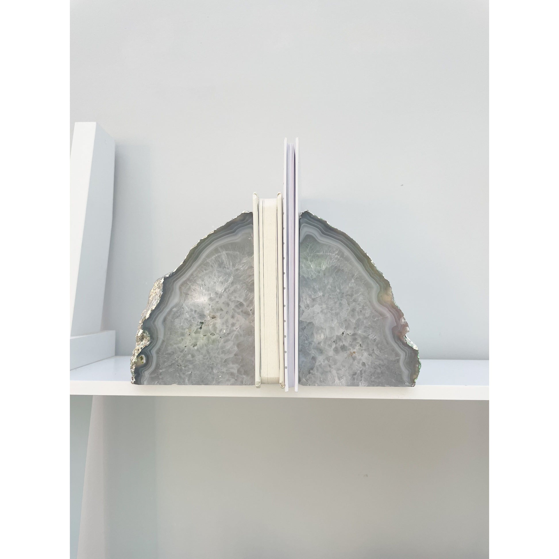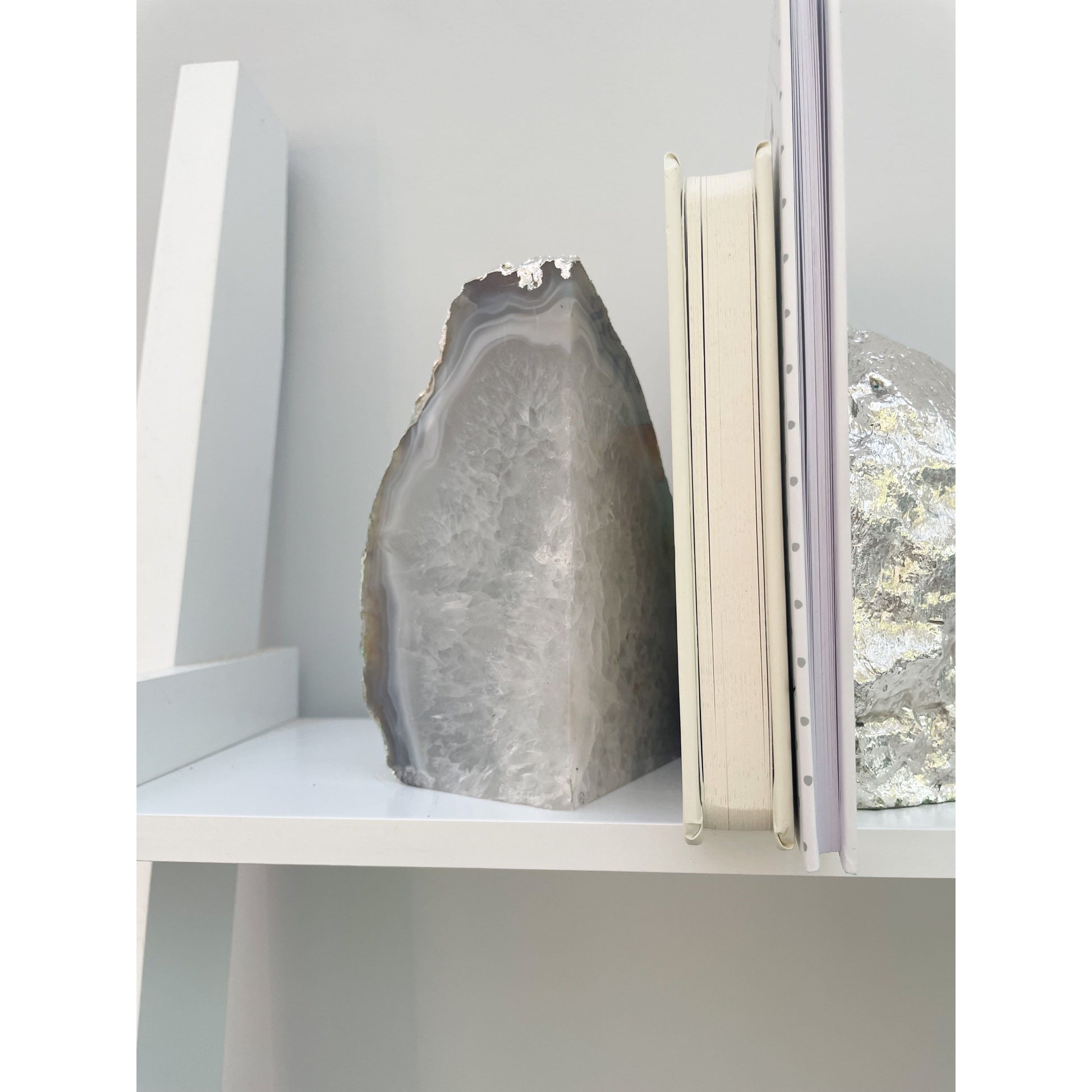 These white agate stone book ends are a wonderful feature to you book shelves. The agate has a relatively low frequency, therefore is a very peaceful and soothing crystal